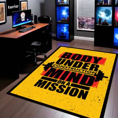 The “Body Under Construction, Mind on a Mission” gym quote floor mat is built for those who train with purpose. Featuring bold black and red typography on a gritty yellow background, this design delivers raw, no-excuses energy that instantly upgrades your workout space.